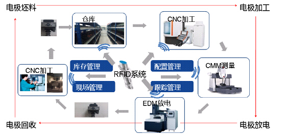 解決方案:對每個電極治具上安裝RFID電子芯片,對電極的設計延伸到制造、測量和使用的全過程中實現數據和制造無縫交互,實現全流程的自動化,無人化。