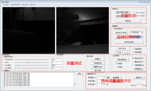 系統(tǒng)組成:硬件:該系統(tǒng)的主要硬件有:兩個(gè)工業(yè)相機(jī)(如圖1(a)),主動(dòng)光立體標(biāo)靶(如圖1(b)),工控機(jī)(如圖1(c)),標(biāo)定標(biāo)靶(相機(jī)標(biāo)定標(biāo)靶+特征標(biāo)靶,如圖1(d))。軟件:標(biāo)定,測量及機(jī)器人控制軟件平臺(手眼標(biāo)定,立體標(biāo)靶標(biāo)定,系統(tǒng)測量精度評價(jià),測量測試,圖像采集及測量,機(jī)器人控制)如圖2所示。測量深度范圍:500mm~3000m,測量視場見表1。該系統(tǒng)能夠勝任以下任務(wù):1)機(jī)器人位置姿態(tài)的實(shí)時(shí)測量;2)機(jī)器人視覺伺服;3)機(jī)器人參數(shù)標(biāo)定;4)機(jī)器人軌跡姿態(tài)性能特性評定。